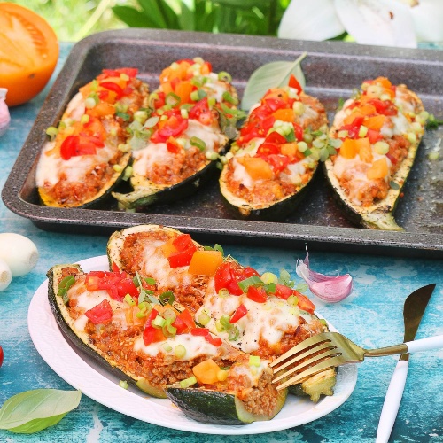 W trakcie szykowania farszu minie zapewne 15 minut podpiekania cukinii. Blaszkę z łódeczkami ostrożnie wyjmij z piekarnika (piekarnika nie wyłączaj) i odstaw na bok. Jak tylko farsz będzie już gotowy można zacząć nadziewać nim cukinie. Farsz może być jeszcze gorący. Dokładnie wypełnij środek każdej łódeczki i wyłóż farsz "górką".